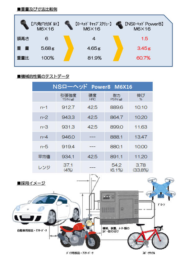 『NS-LOW HEAD Power8』は、従来の強度区分4.8/5.8を大きく上回る強度区分8.8相当を極低頭形状で実現した高強度極低頭六角穴付ボルトを在庫販売開始致します。